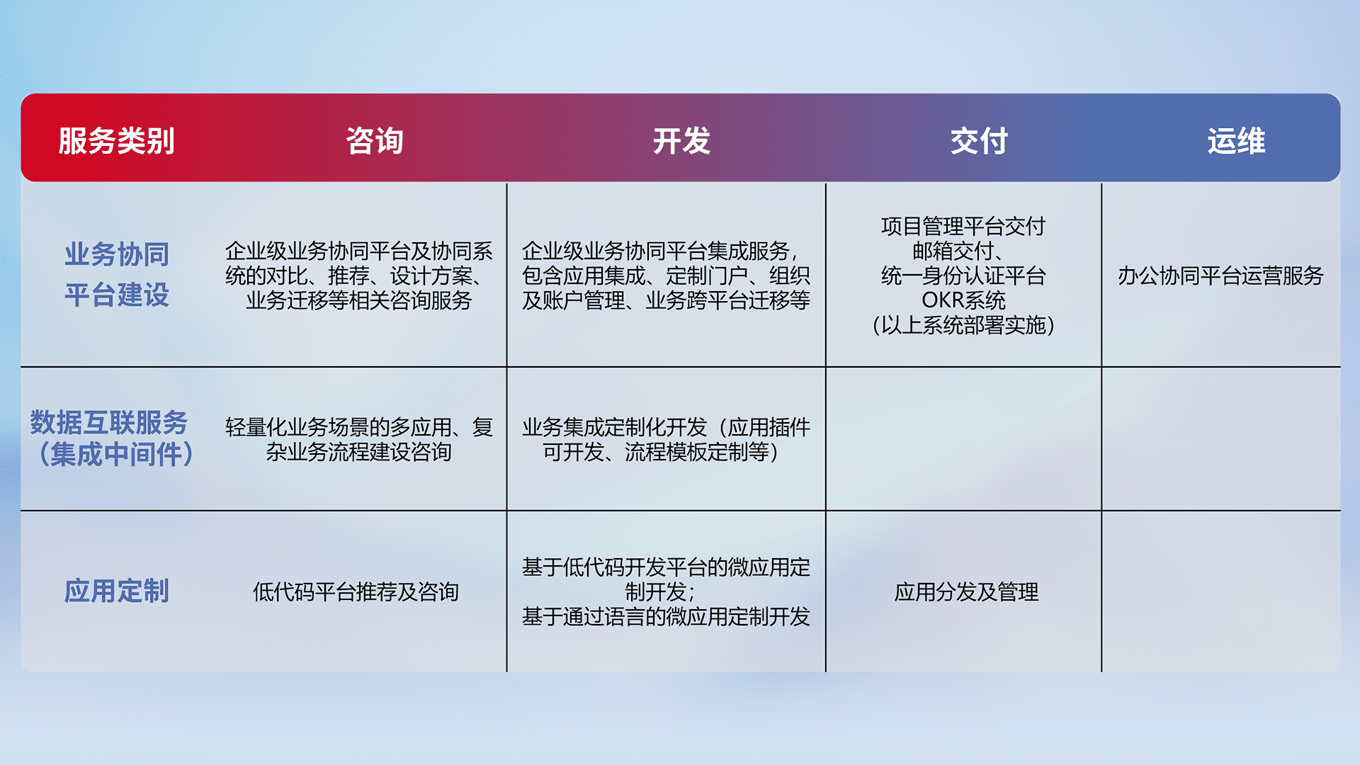 针对钉钉、、、企微、、、IDaas等平台级产品提供产品的规划、、、方案、、、交付、、、定制化开发等服务,,,实现如统一协同办公、、、、智能客户服务、、、、混合会议管理、、、、智能数据查询、、、、等业务场景,,实现数字化转型。。。。