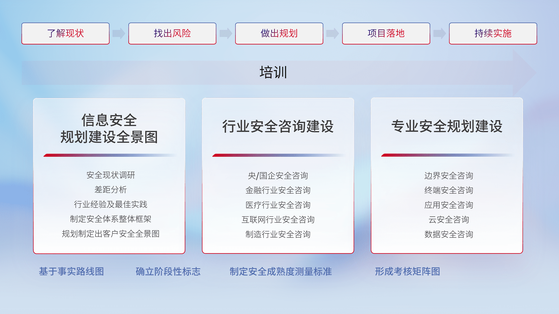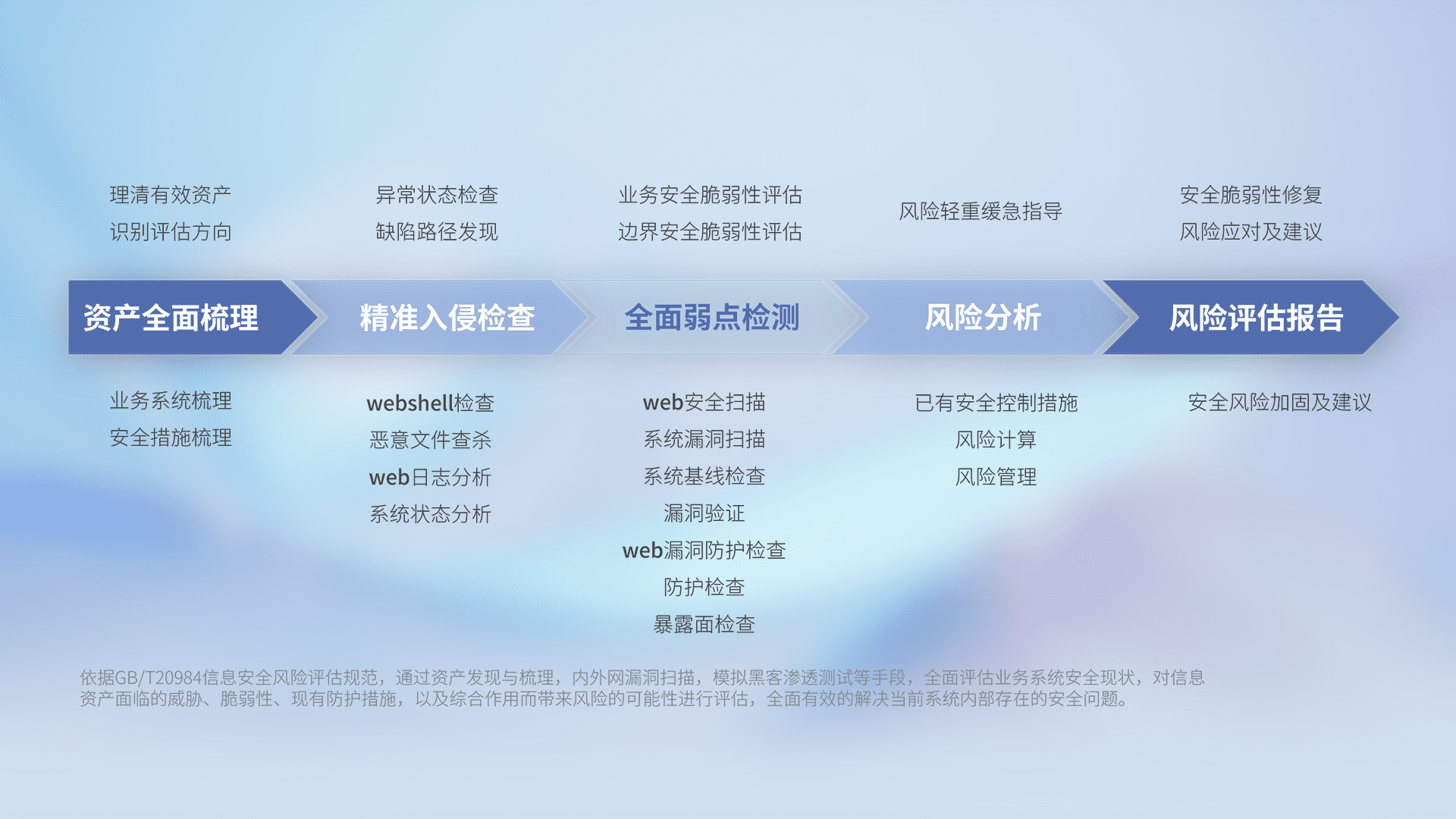 针对客户行业特性,,,,以专业的安全服务+多厂商联合解决方案提供专属的一站式安全管理服务,,,,帮助客户全面感知网络空间威胁,,,,基于识别、、、、检测、、、、分析、、、、防护、、、、监测、、、响应的服务理论模型,,,,从方案咨询、、、、集成交付、、、评估验证、、、、优化加固、、运维运营,,,致力于为客户提供完整的闭环管理式安全服务。。。以实战经验为客户打造高抵御风险的安全体系,,,,帮助客户发现威胁、、、、对抗威胁、、、、处置威胁,,不断积累安全对抗能力,,,,持续保障数字化安全。。