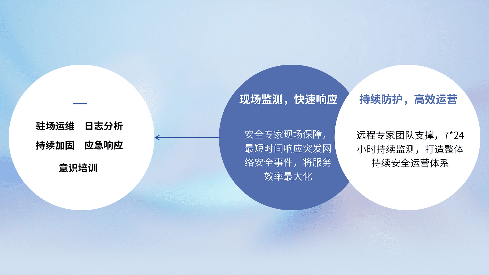针对客户行业特性,,提供专属的一站式安全管理服务,,,,帮助客户全面感知网络空间威胁,,,,通过安全专家的线上、、线下防护支持,,实现风险闭环,,,,将安全保障常态化,,为客户打造常态化安全运维运营服务。。